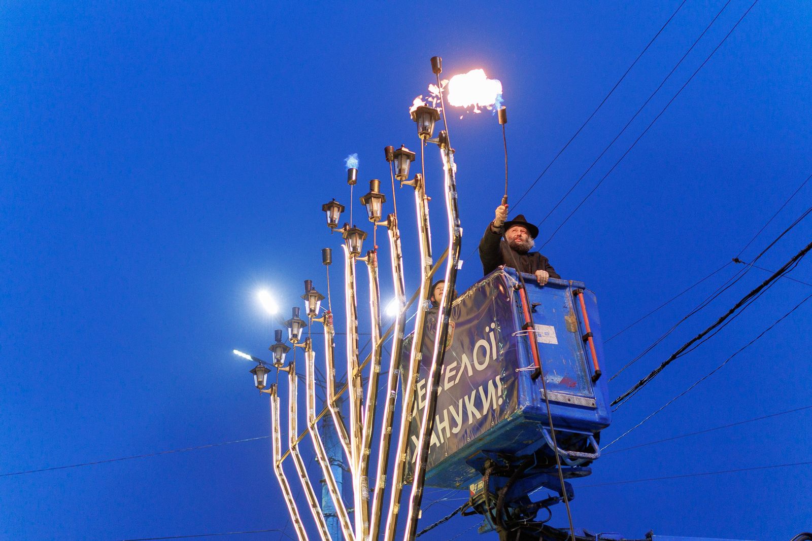 7 декабря в Бердичеве (Житомирская область) на Центральной площади провели первый день иудейского праздника Хануки. Его особый символ – воспаление ритуального девятиподсвечника, увеличивая ежедневно количество свечей в нем. Традиционно 11 год на площади зажигают огоньки на большой церемониальной ханукии. Вчера вечером взвился первый. Проводил церемонию главный раввин Бердичева Моше Талер.  После всех обращений Моше Талер и Сергей Орлюк с помощью спецтехники поднялись к самой вершине ритуальной ханукии. Главный раввин зачитал молитву и вместе с городским головой зажег первый огонек. В конце мероприятия собравшиеся сделали общее фото. После этого иудейская община угостила толпу традиционными пончиками жареными в масле.