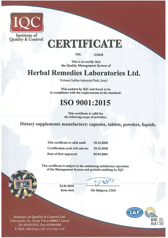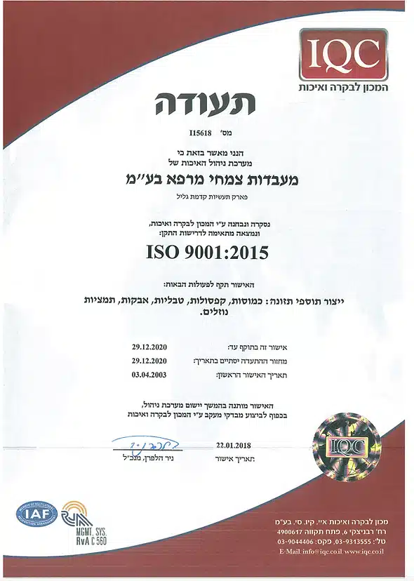 Производство продукции, имеет всю необходимую сертификацию, как израильскую так и международную, включая GMP от министерство здравоохранения Израиля и Американского FDA.